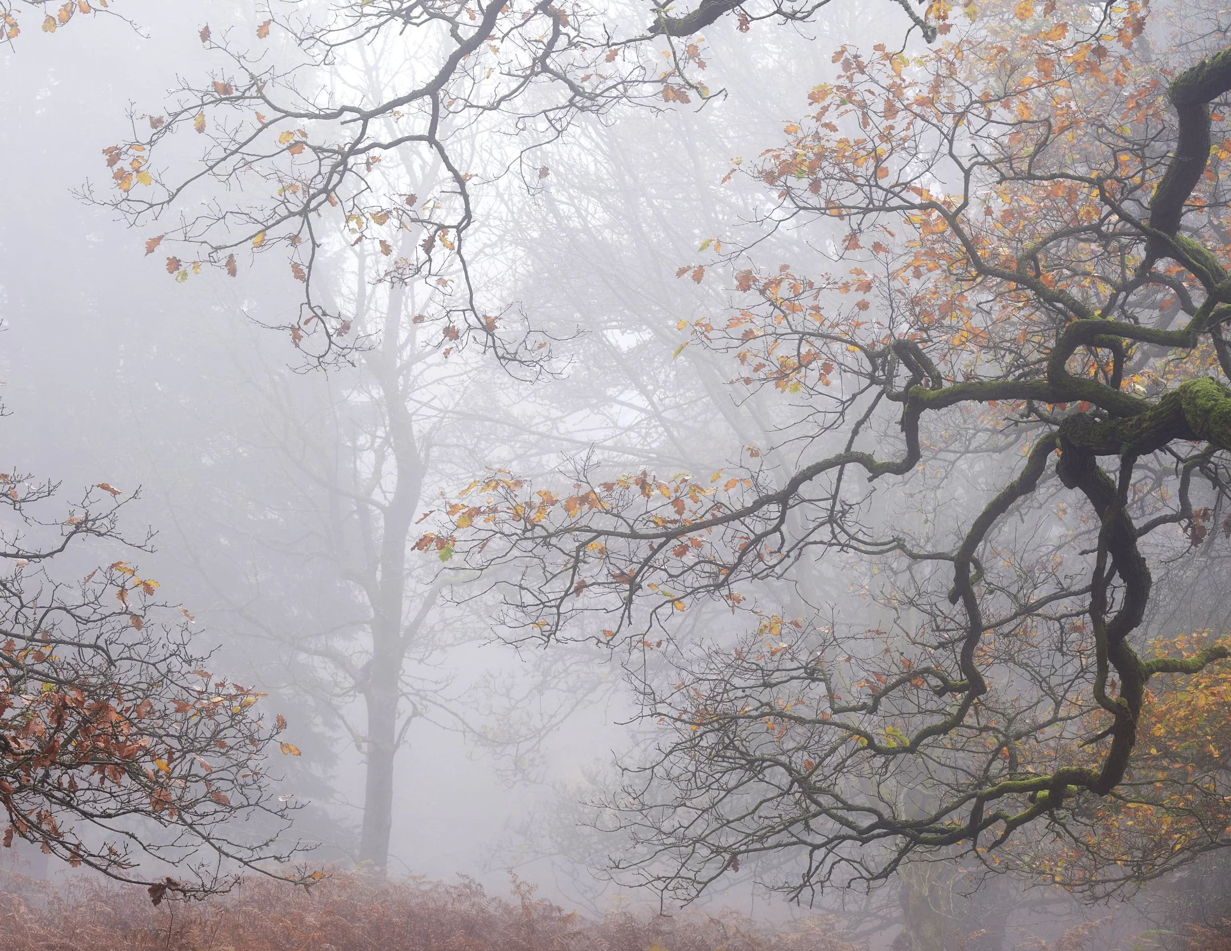 Mystery. This is a very simple composition but one that I really like. The late autumn oak trees at Padley Gorge framing a distant tree giving depth through the morning mist.