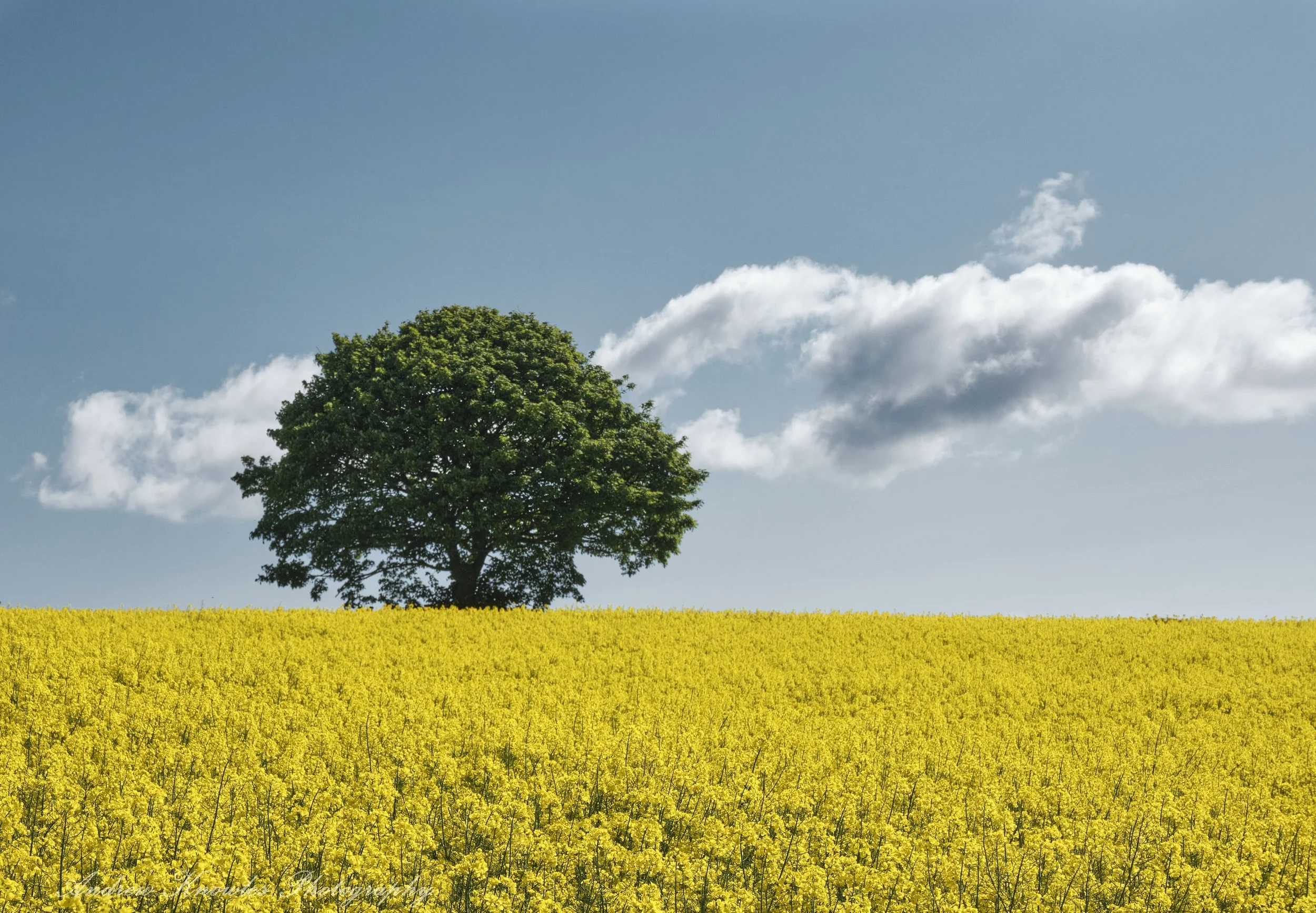 Prevailing wind. This exposed Larch retains its colour through the winter. The lean away from the prevailing wind adds tension to the image and the square crop gives space above the tree. I used a negative vignette to really bring out its form.